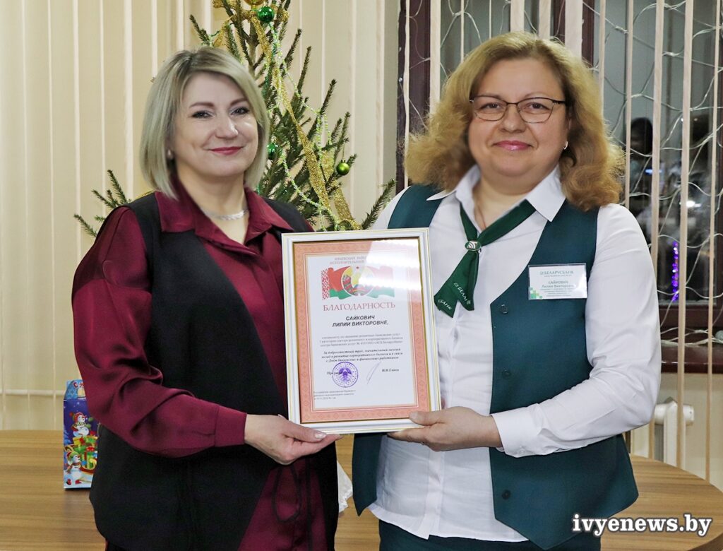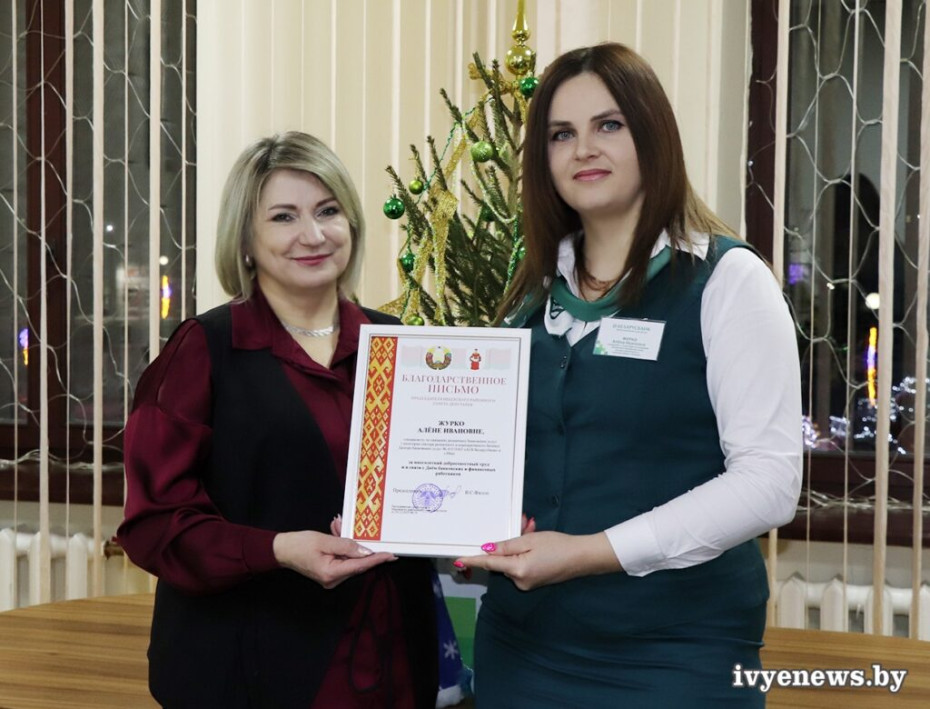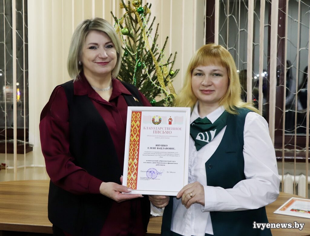 Благодарственным письмом Ивьевского районного Совета депутатов отмечены специалисты по оказанию розничных банковских услуг I категории сектора розничного и корпоративного бизнеса Елена Янушко и Алена Журко.